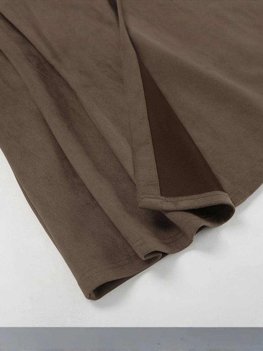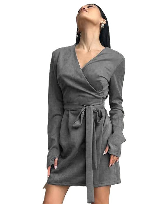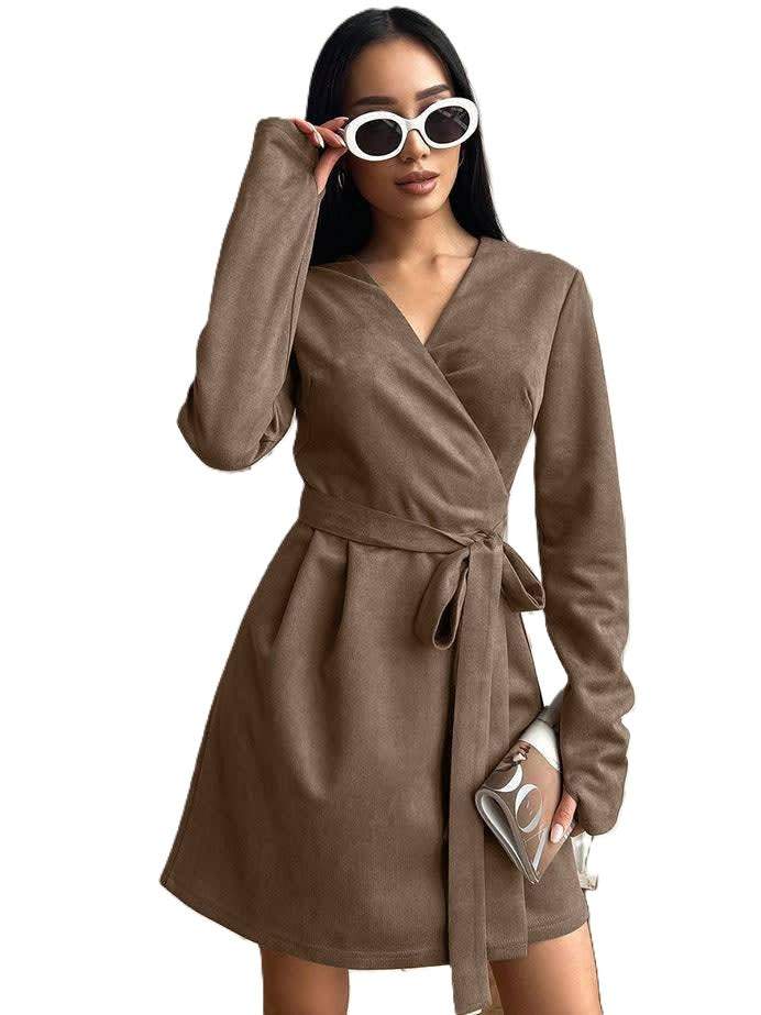 Sa coupe A-ligne à taille haute sublime la silhouette, tandis que le col V et les manches longues apportent une élégance intemporelle. La ceinture à nouer souligne la taille avec une touche de raffinement personnalisée.